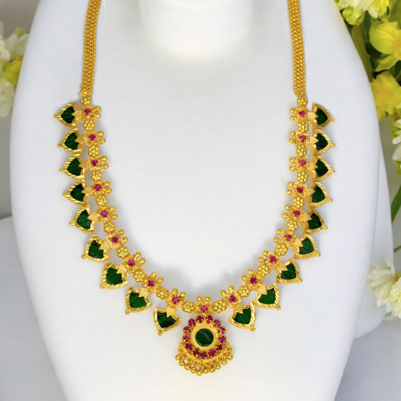 Gold Plated Kerala Traditional Palakka Necklace is Simple and ethnic South Indian, Kerala Jewellery. This Jewelry has been arranged beautifully with Palakka and stones. Small round Pendant has golden bead hangings. Length can be adjusted with the backlink chain. It is best suited on festive occasions, Marriages and as Bridal wear and dancewear.
