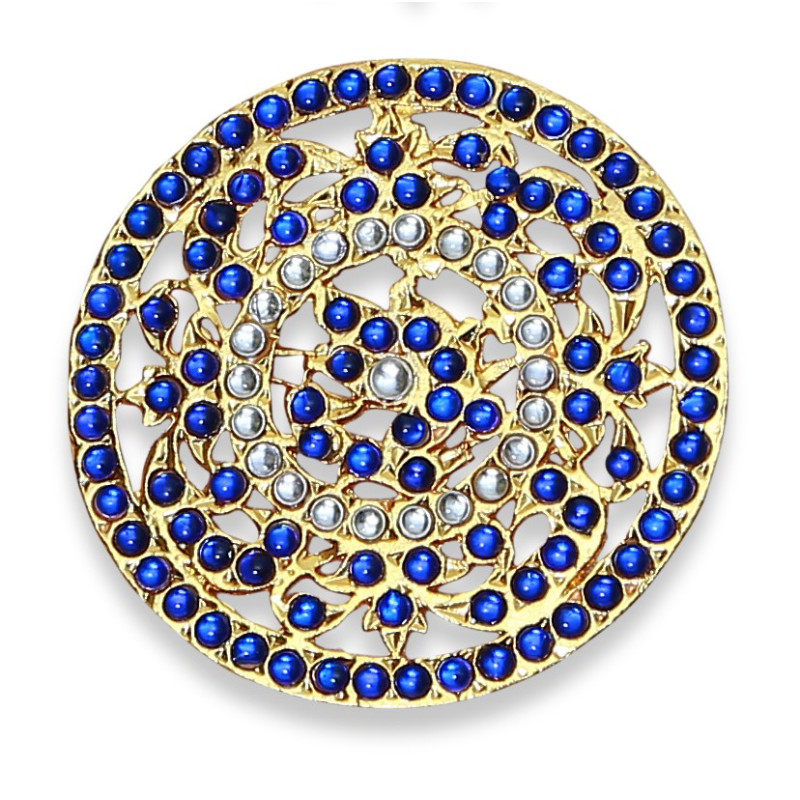 This piece of Blue and White stone studded Imitation Temple Jewellery Rakodi/Billai is placed on top of the hair bun to cover the hair. This is on the back side top of the dancer's head. This piece of jewelry can be used for Bharatanatyam, Kuchipudi and other Indian classical dance performances.