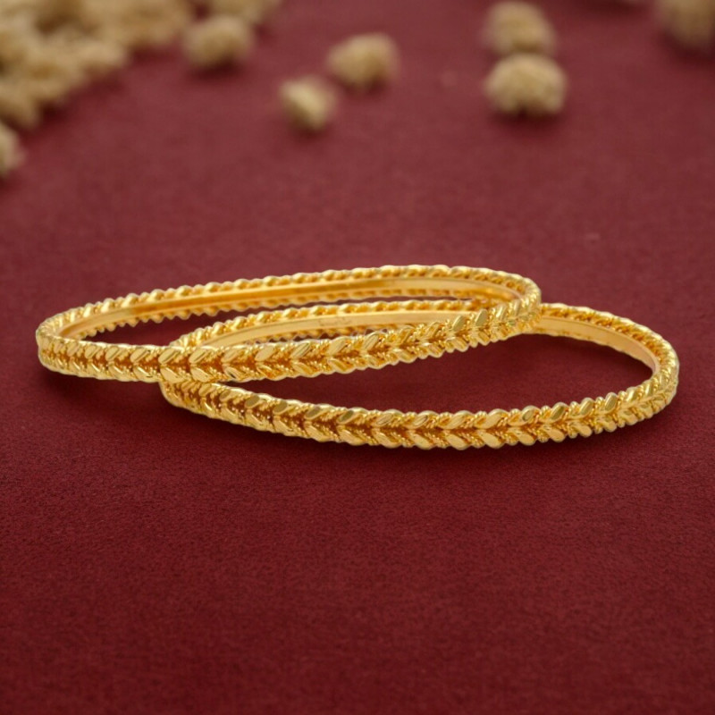 Gold Plated Leaf and Spiral Design Bangles features a classic leaf and spiral wire design, perfect for wearing as pairs or sets. It adds a touch of style to any outfit.