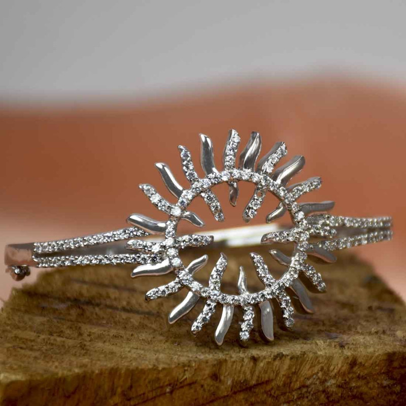 Premium Fashion Silver-tone American Diamond Open Bangle for ladies. Beautify your wrist with the stunning sun design American Diamond open bangles for a party or as Casual Wear.