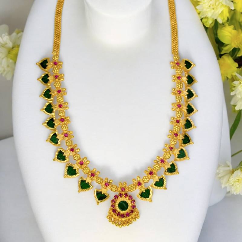 Premium Gold Plated Traditional Indian Palakka Necklace is Simple and ethnic South Indian, Kerala Jewellery. This Jewelry has been arranged beautifully with Palakka and stones. Small round Pendant has golden bead hangings. Length can be adjusted with the back link chain. It is best suited on festive occasions, Marriages and as Bridal wear and dancewear.
