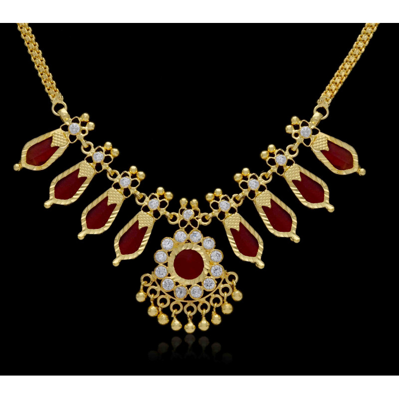 Kerala Traditional Simple Nagapadam Necklace is Simple and ethnic South Indian, Kerala Jewellery. This gold plated Jewelry has been arranged beautifully with Nagapadam and stones. Small round Pendant has golden bead hangings. Length can be adjusted with the backlink chain. This imitation jewellery is best suited on festive occasions, Marriages and engagements with saree or ethnic outfits.