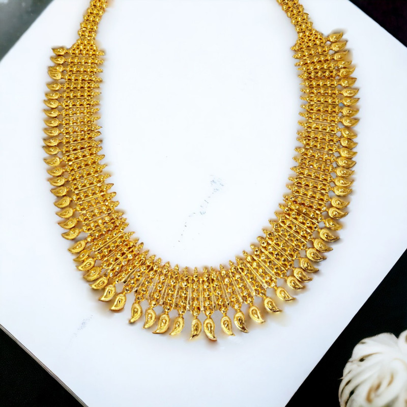 South Indian Gold Plated Broad Bridal Mango Haram, an exquisite piece of traditional wedding jewelry. This broad designer mangamala can be worn as the last chain or hip chain in a South Indian wedding. Its classic, lightweight broad mango design is perfect for traditional occasions and weddings. This piece will complement any traditional attire and make you stand out.