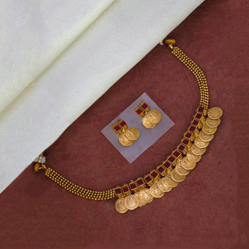 Elevate your traditional look with this Traditional Antique Kemp Lakshmi Kasu Choker Set. This ethnic kasumala showcases a beautiful arrangement of embossed Lakshmi coins complemented by square-cut red and green kemp stones. The layered mesh chain and matching coin stud earrings add to the regal charm of the piece. Ideal for festive occasions, weddings, and temple wear, this set blends heritage design with modern craftsmanship.