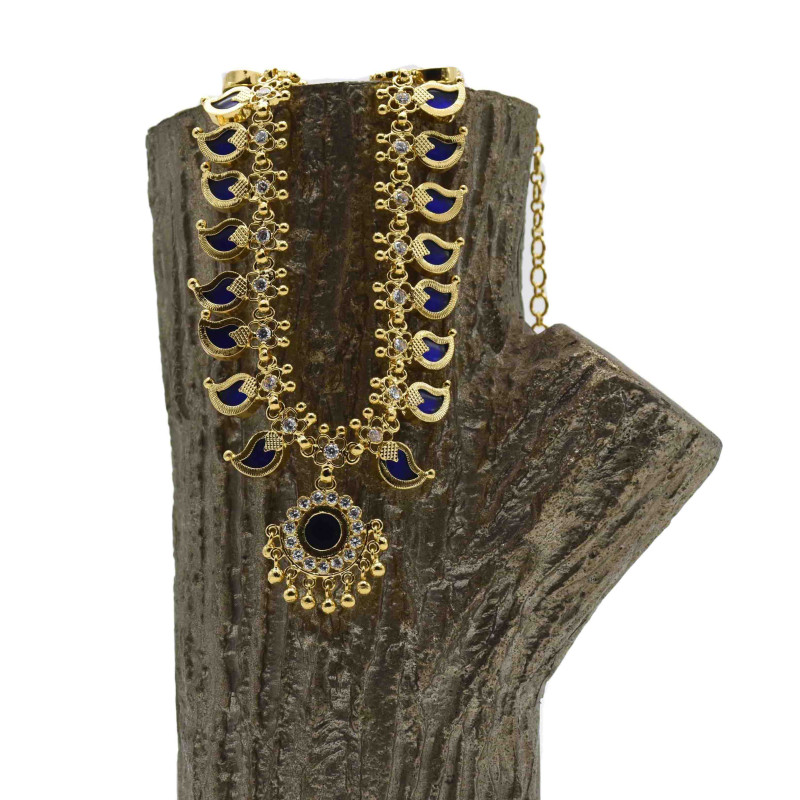This beautiful one gram gold Blue Mango Long Chain (Manga Mala) is traditional and ethnic South Indian, Kerala Jewelry. Blue Mango beads beautifully arranged along with white stones.It is suitable for women on any occasions like Marriages and engagements. Also worn by classical dancers.