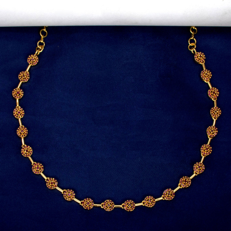 Marvelous Gold Plated Round Stone Necklace for girls and women. It has an adjustable link chain. The round ruby/CZ stones design gives this Necklace a dazzling look and will attract everyone's attention at a party or wedding occasion. A beautiful and smart gift for your loved ones on auspicious events like anniversary, birthday, valentines day, or Christmas.