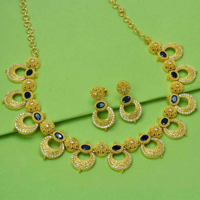 AD Blue Sapphire Floral Chandbali Necklace Set is apt for any age woman. Stunning American Diamonds and big blue sapphire studded intricate Chandbali motifs along with floral motifs add elegance to this neckpiece. This gold plated stone choker has matching chandbali earrings and a length adjustable backlink chain. Apt for festive, wedding and engagement occasions.