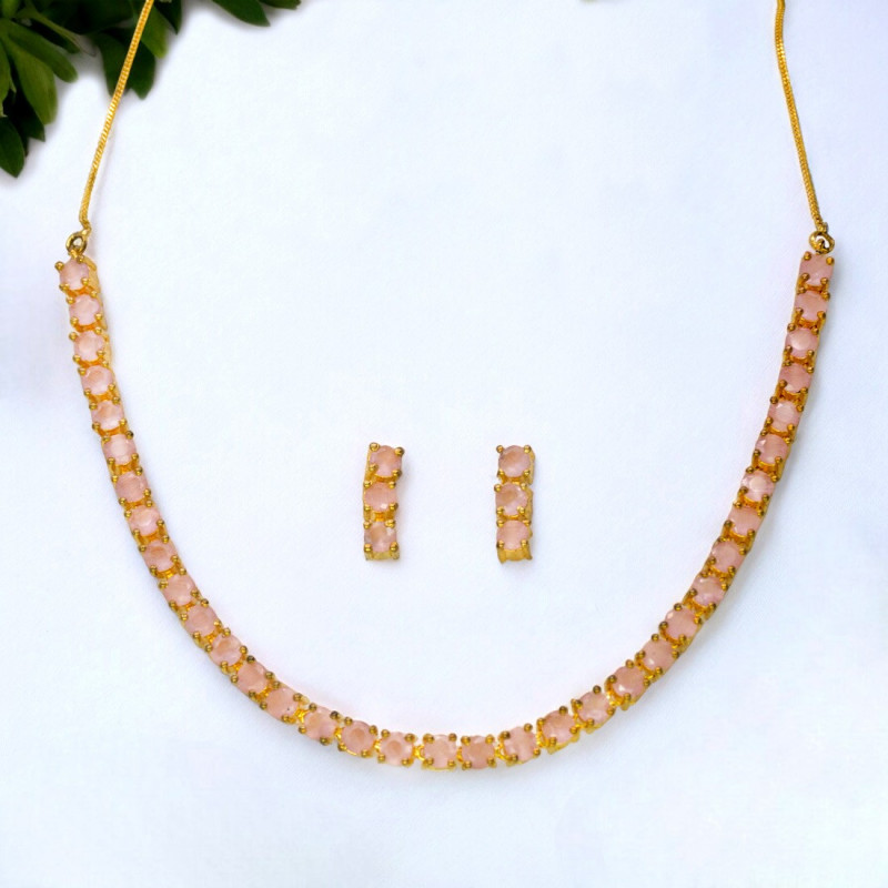 Stunning Baby Pink American Diamond Necklace Set for women, featuring round zirconia stones that have been designed with great artistry and creativity. This exquisite jewelry set also includes matching drop earrings, an adjustable chain, and is secured with an S-hook. It makes for a perfect gift for your loved ones on special occasions like birthdays, anniversaries, Valentine's Day, or Christmas.
