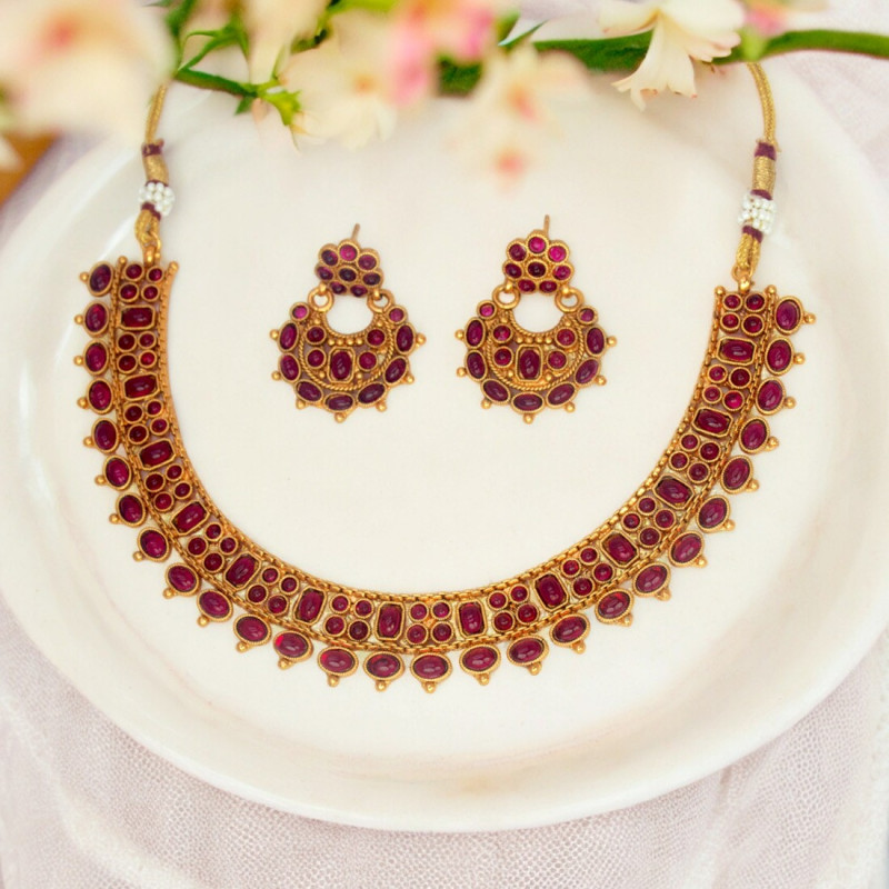 Elegant Antique Finish Kemp Stone Necklace Set, perfect for weddings and festive occasions. Crafted with artistry and creativity, these stunning choker and matching bali earrings feature Kemp red square, oval, and round stones in an elegant design with antique red gold plating. It makes an elegant gift for special occasions like anniversaries, birthdays, and holidays.
