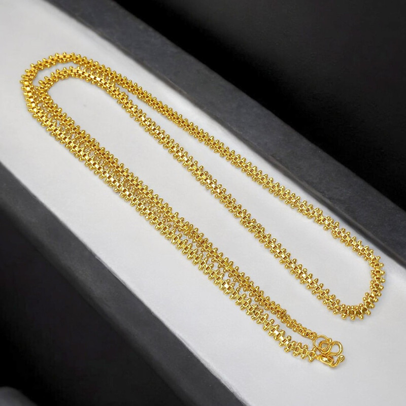 Elevate your style with our Trendy Designer Gold Plated Rava Chain! This stunning intricate design and lustrous gold plating make it a versatile accessory that can be paired with a variety of ensembles. Whether you're dressing up for a special occasion or looking to elevate your everyday look, this gold-plated chain is a great choice. Don't miss out on this must-have accessory- get yours today!