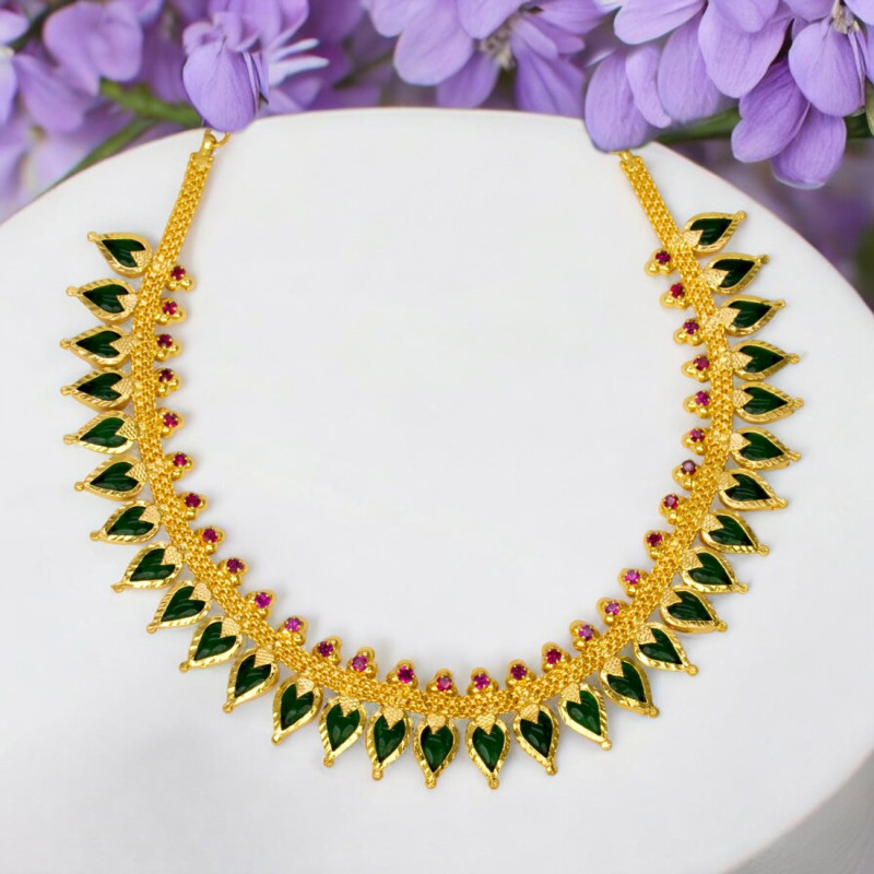 Elegant Kerala Traditional Gopi Design Necklace for Women. This premium gold-plated traditional jewellery design showcases the rich and dynamic jewellery culture of Kerala. It features an adjustable back chain and adds a classic touch to sarees or ethnic wear. This classic choker is commonly worn by South Indian brides and women on weddings and festive occasions.