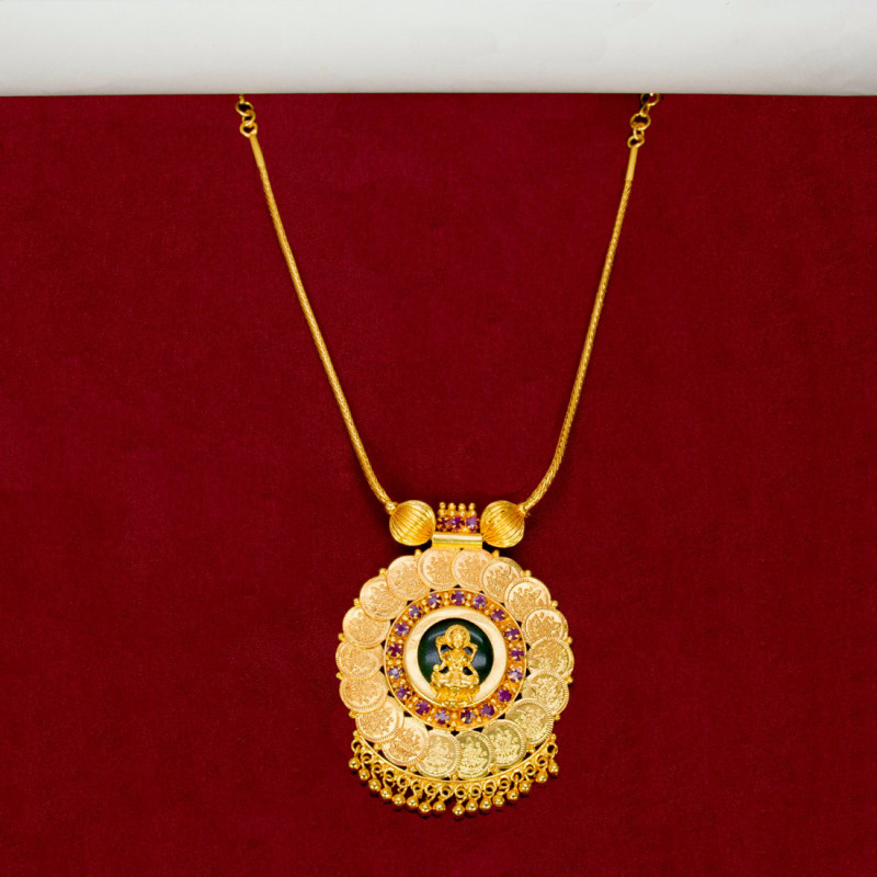 Elevate your elegance with the Traditional Gold-Plated Lakshmi Kasu Pendant Necklace, a timeless masterpiece from Kollam Supreme Premium Fashion Jewellery. This exquisite piece is inspired by the rich heritage of South Indian temple jewellery, making it the perfect accessory for weddings, festive occasions, and bridal celebrations.