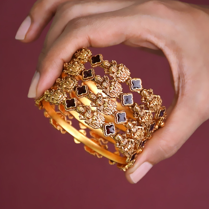 Antique Matte Finish Lakshmi Enamel Bangle with enamel design in red and green variants – a perfect blend of heritage and elegance. This exquisite piece complements traditional Kerala sarees and ethnic wear beautifully. Ideal for special occasions, cultural celebrations, and festive gatherings.