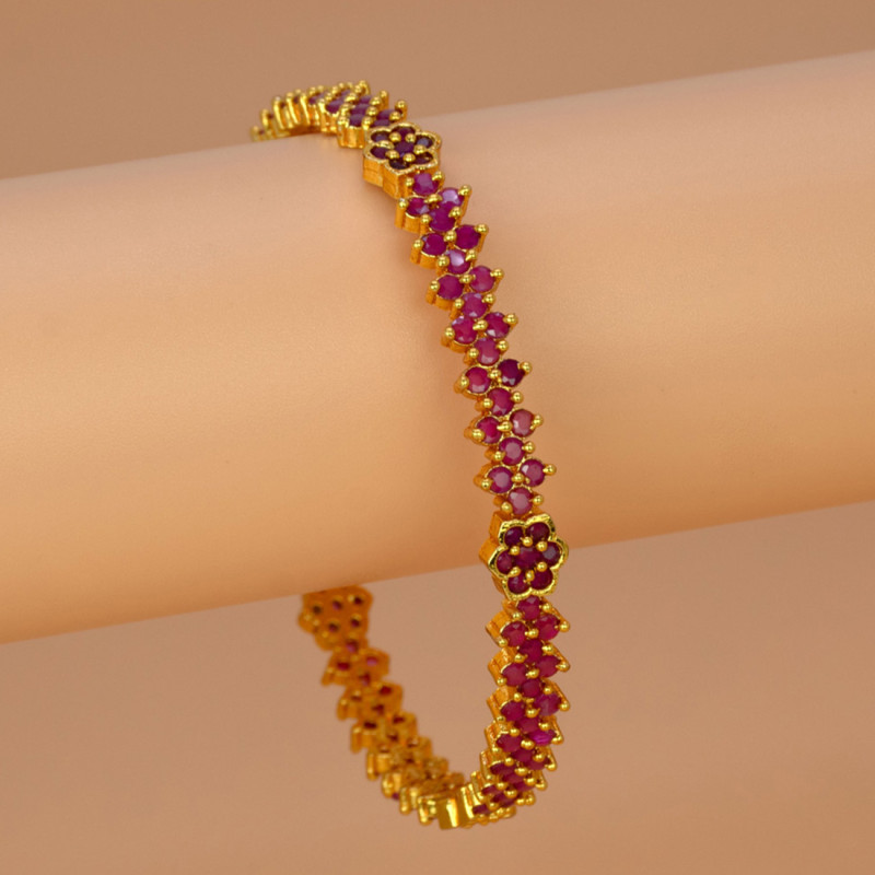 Enhance your jewelry collection with this Elegant Gold Plated Floral Semi-precious Stone Bangle crafted with premium-quality gold-plating. Each bangle features intricately designed flower patterns and sparkling CZ/Ruby stones in vibrant hues, perfect for festive occasions, weddings etc.