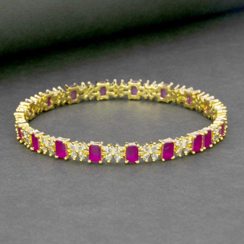 Elevate your traditional style with this Sparkling Gold Plated Floral CZ Ruby Bangle. Crafted with precision, the bangle features radiant Sparkling Gold Plated Floral CZ Ruby Bangle arranged in a graceful floral pattern, beautifully highlighted by a premium gold plated finish.