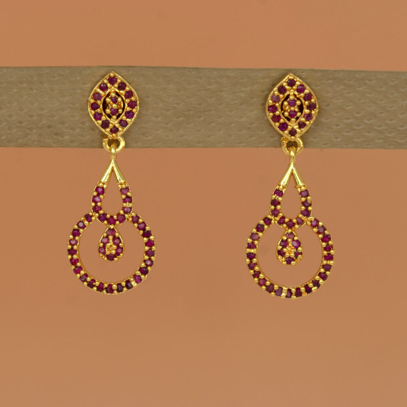 Stylish Gold-Plated Ruby Stone Drop Earrings embellished with sparkling ruby stones. Perfect for parties, weddings, and festive occasions. Lightweight and stylish designer jewelry for fashionista women.