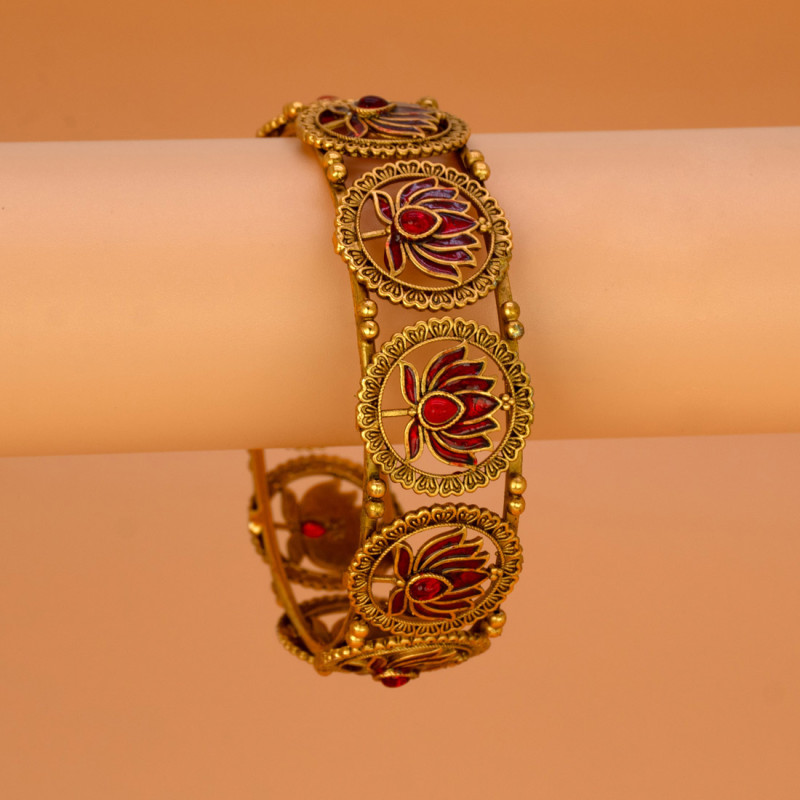 Contemporary Matte Finish Kemp Lotus Bangle for women. This antique gold plated lotus bangle embellished with kemp stone is available in red, green, and multi-color variants for a graceful ethnic look. Ideal for special occasions, cultural celebrations, and festive gatherings.