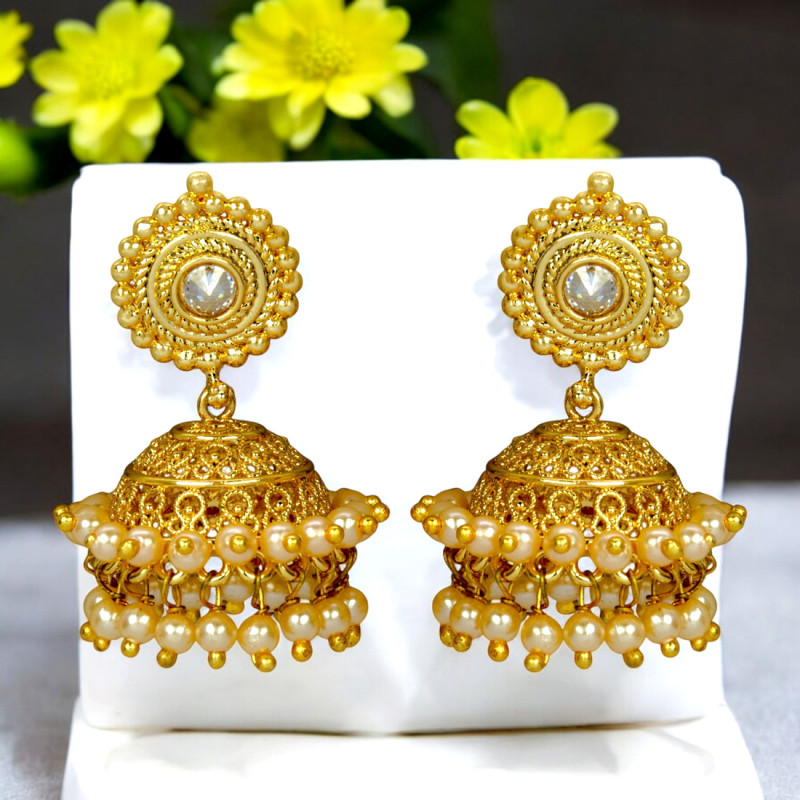 Elevate your style with these elegant Antique Pearls Hanging Small Jhumka Earrings. These jhumkas combine traditional design with classic charm, perfect for any occasion. Featuring an antique gold-plated finish and intricate detailing, these earrings exude vintage beauty. The delicate pearl hangings add a graceful, feminine touch. Lightweight and comfortable, they are ideal for all-day wear.
