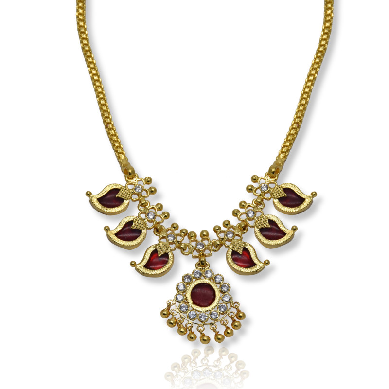 One Gram Gold Plated Traditional Mango Necklace is Simple and ethnic South Indian, Kerala Jewelry. This Jewelry has been arranged beautifully with Mango enamel motifs and ruby stones. This have small round pendant with Golden bead hangings. Length can be adjusted with backlink chain. It is best suited on festive occasions, Marriages and as Bridal wear and dancewear.